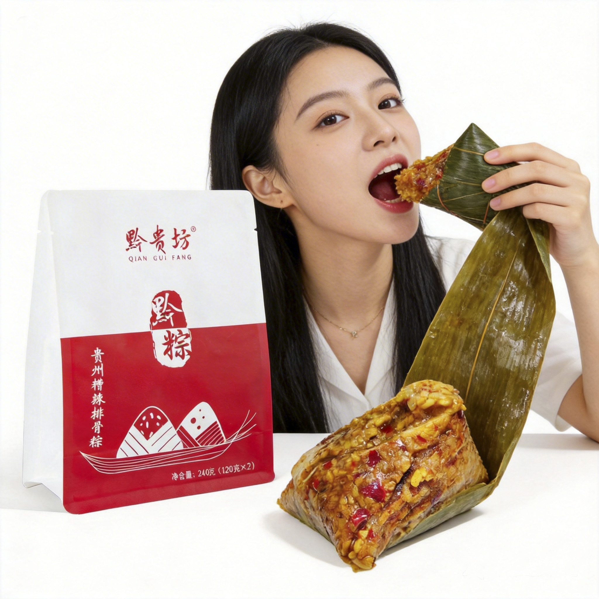 相较于普通甜粽的甜腻、咸粽的单一,贵州黔粽以贵州特色糍粑辣椒、糟辣椒为风味核心,搭配本土糯米与鲜货食材,形成“辣而不燥、酸香回甘”的独特口感,兼具地域辨识度与记忆点。同时,黔贵坊深耕产品研发,攻克辣椒与糯米融合的锁味难题,兼顾传统手工质感与现代标准化生产,既保留传统手工艺底蕴,又解决产能与口感稳定问题,用硬核产品力支撑差异化定位,让“吃黔粽就是尝鲜”成为消费共识。